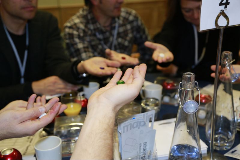In Face to Face, teams are faced with a series of multiple choice questions projected on a central screen. Each answer relates to a coloured stone. The question is posed, everyone has a minute to consider their answer and pluck the appropriate coloured stone from their bag. Then on request, at the same time, they all thrust their hands into the middle of the circle. They then open their fist with palm up, showing their coloured stone. Each participant is given one minute to explain their decision to the group. A gong rings indicating that participants must move to another table. The process is repeated until the allocated time is elapsed.